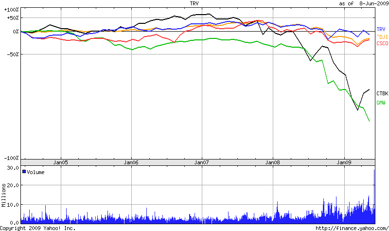 チャートを見ると、外される2銘柄は当然ながら過去5年で70%以上下げていますが、意外にも08年1月までは大きな差は見られません。(GMは別)