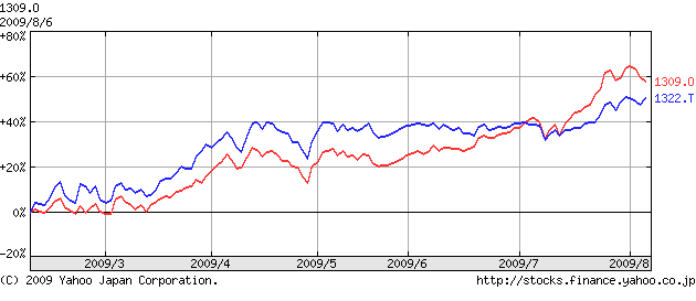 以下のグラフはここ半年の上証50(1309)とパンダ(1322)のパフォーマンスを比較したものです。