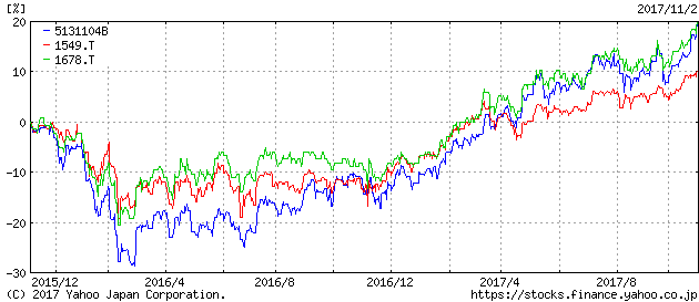 2年間なので信託報酬の差で1549の方が1%高いリターンを期待できるはずですが、結果は1678の圧勝!