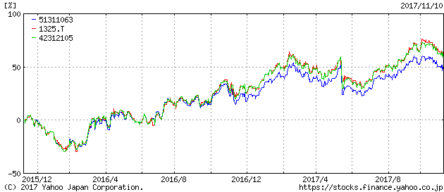 ここ2年のリターンをグラフで見ると赤(1325ETF)と緑(ピクテ投信)はほぼ重なって推移し優劣は言えない誤差レベル。